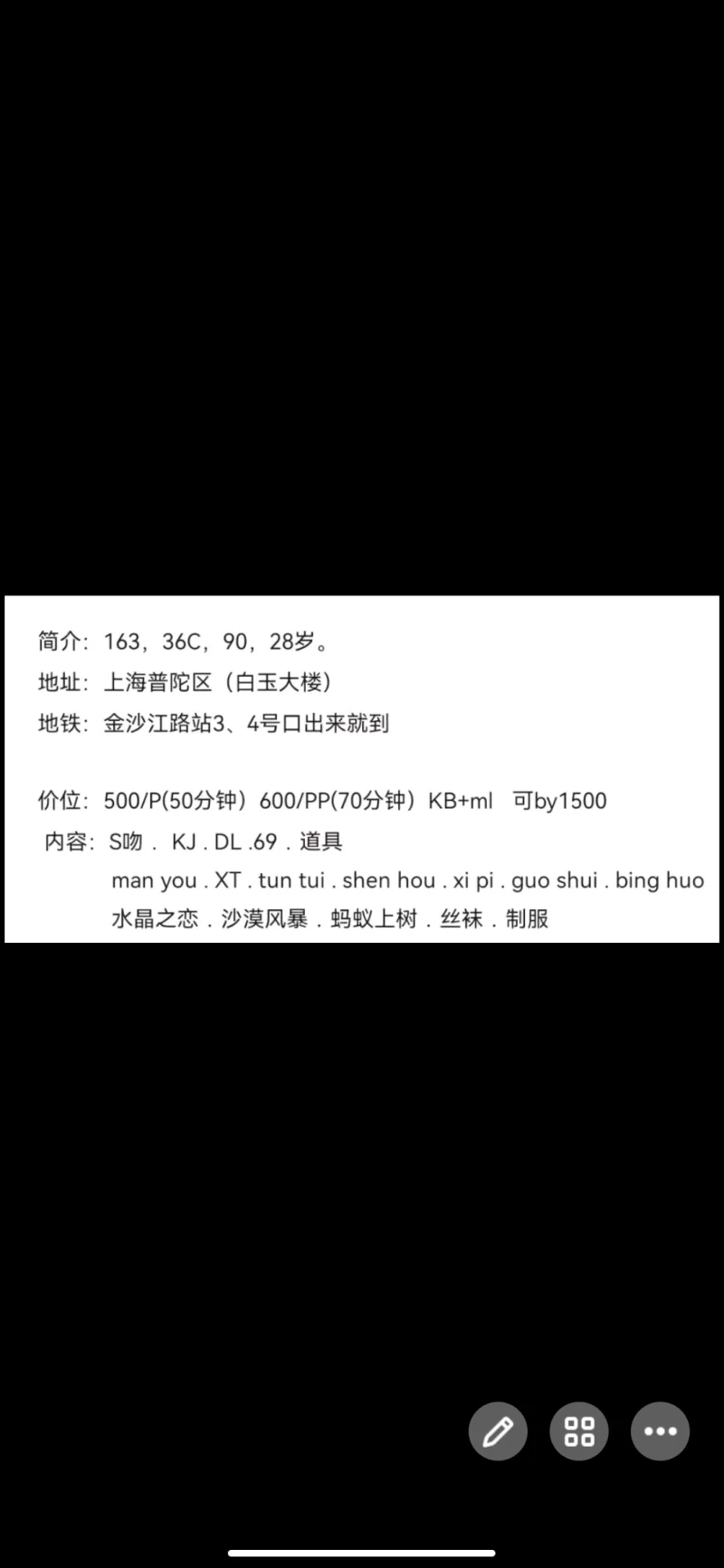信息分类:楼凤兼职 地区:上海市-普陀 信息来源:自己找的 年龄:38左右 颜值身材:70 服务项目:xp kj dl 按摩都有 价格:500p600pp 环境设备:一般 详细地址:本段信息已隐藏,请先登陆。点击登陆 , 或者 点击注册 联系方式(QQ号):本段信息已隐藏,请先登陆。点击登陆 , 或者 点击注册 详细介绍: 该有的服务都有也不贵泄火 楼凤兼职