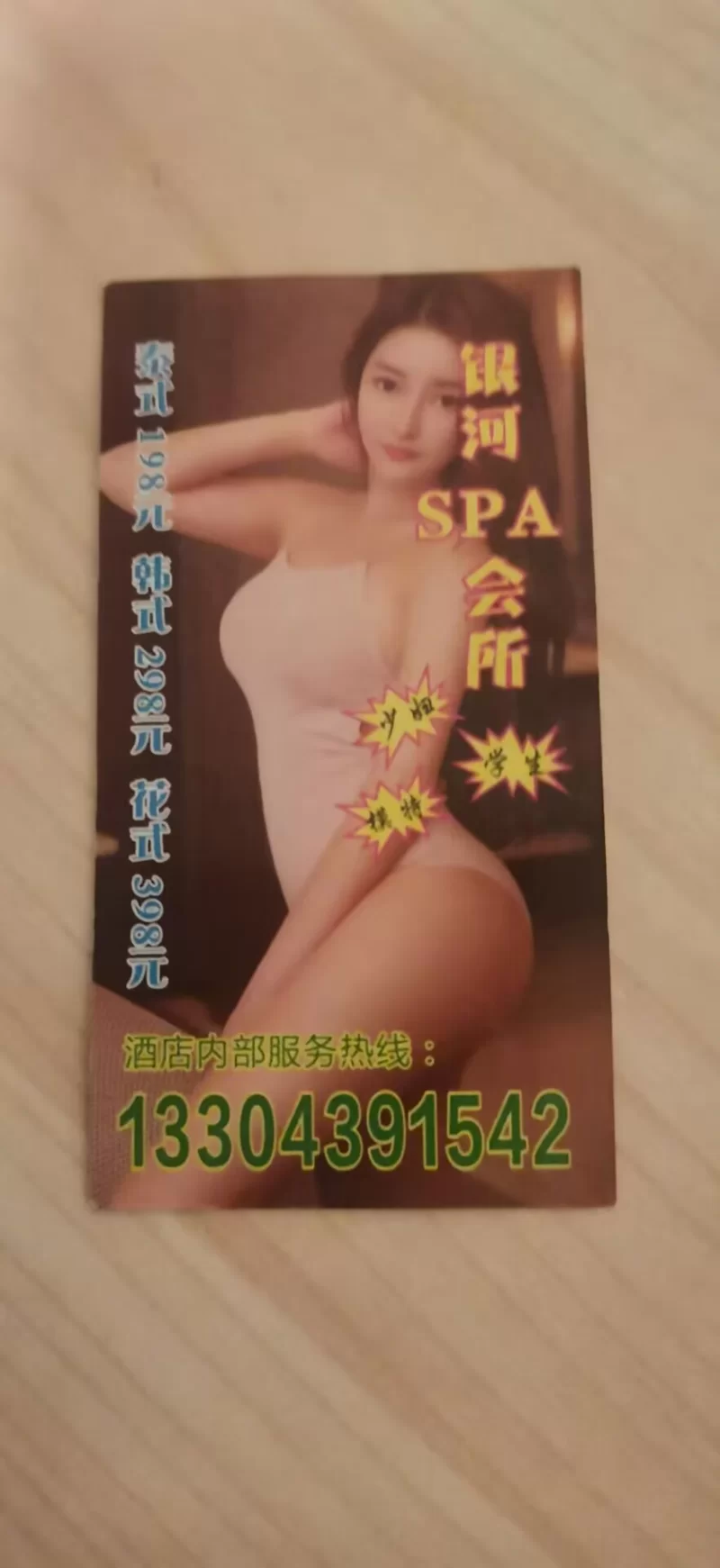 12月13日晚11点多 ,闲来无事,发现酒店房间门口有小卡片,打电话上门服务,经过搞价5张2小时按摩加一次快餐。女孩到了后,介绍服务,付款5张 ,她衣服没有脱,吃屋里吃的,先聊天,然后开始给我带套,亲胸,然后说让我先洗澡,我没当一回事,去洗澡,女孩趁机逃走还顺走我巧克力,我然后打小卡片中介电话,也没人接,联系不到。这明显是预谋好欺骗。真给长春这圈子丢脸。希望圈子里正义之士揪出这对狗男女。附图小卡片。如果找到那人,骗走的5张免费送 ,请发帖留言,我还会捧场。