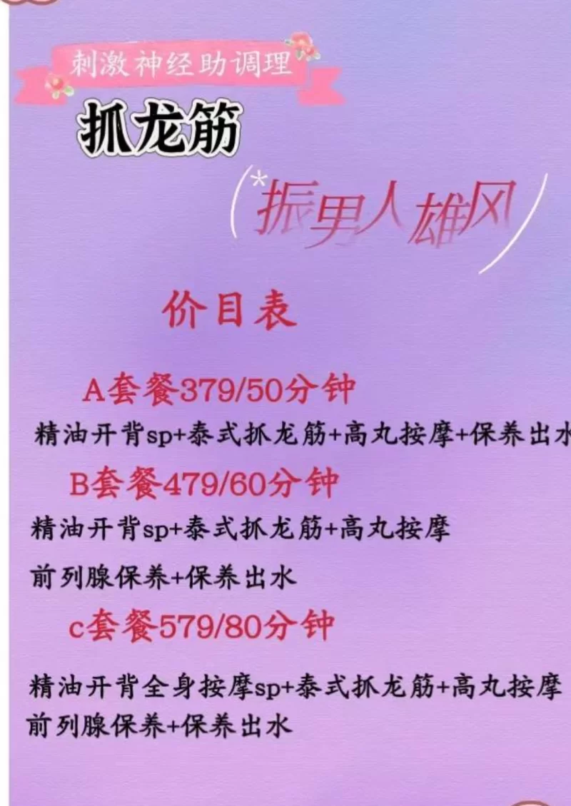 服务项目: 精油开背,泰式抓龙筋,睾丸按摩,保养出水